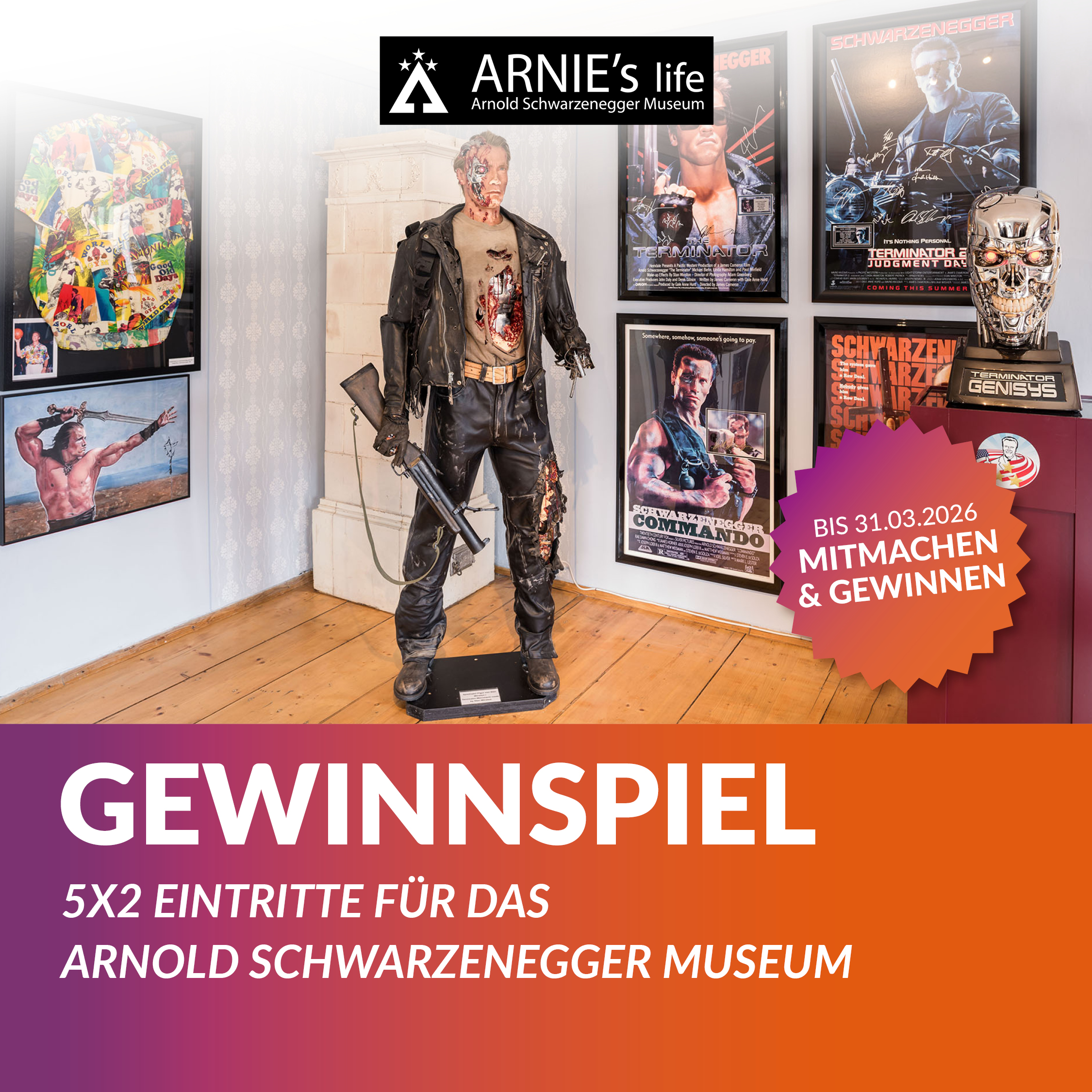 Gemeinsam mit unserem Kooperationspartner Arnie’s Life bringen wir die Geschichte einer Weltikone direkt in die ShoppingCity Seiersberg. Wir verlosen exklusiv 5×2 Eintrittskarten für das offizielle Arnold Schwarzenegger Museum in Thal bei Graz.
