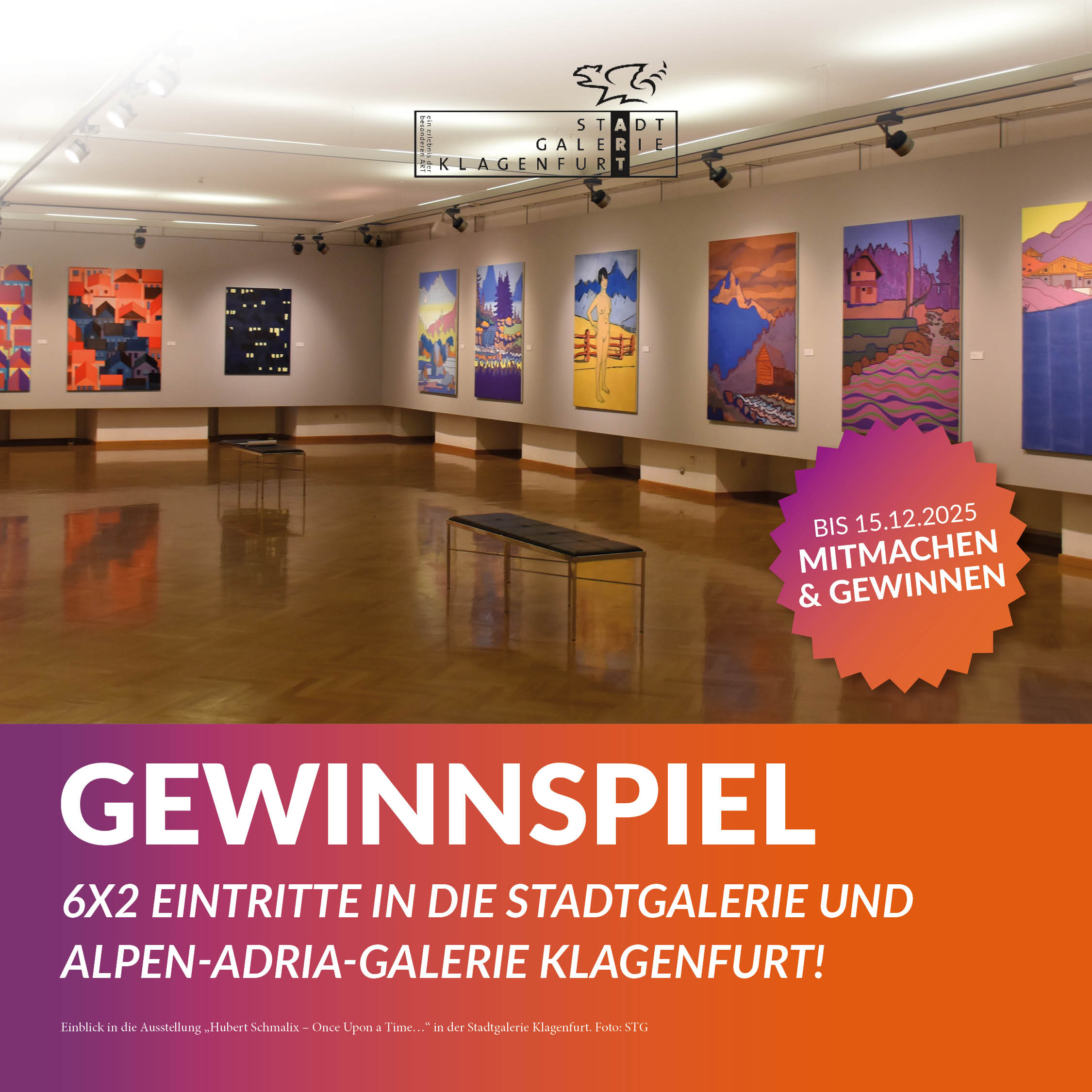 - Gewinn: Je ein Gutschein berechtigt zum einmaligen Eintritt in die Stadtgalerie und in die Alpen-Adria-Galerie Klagenfurt.