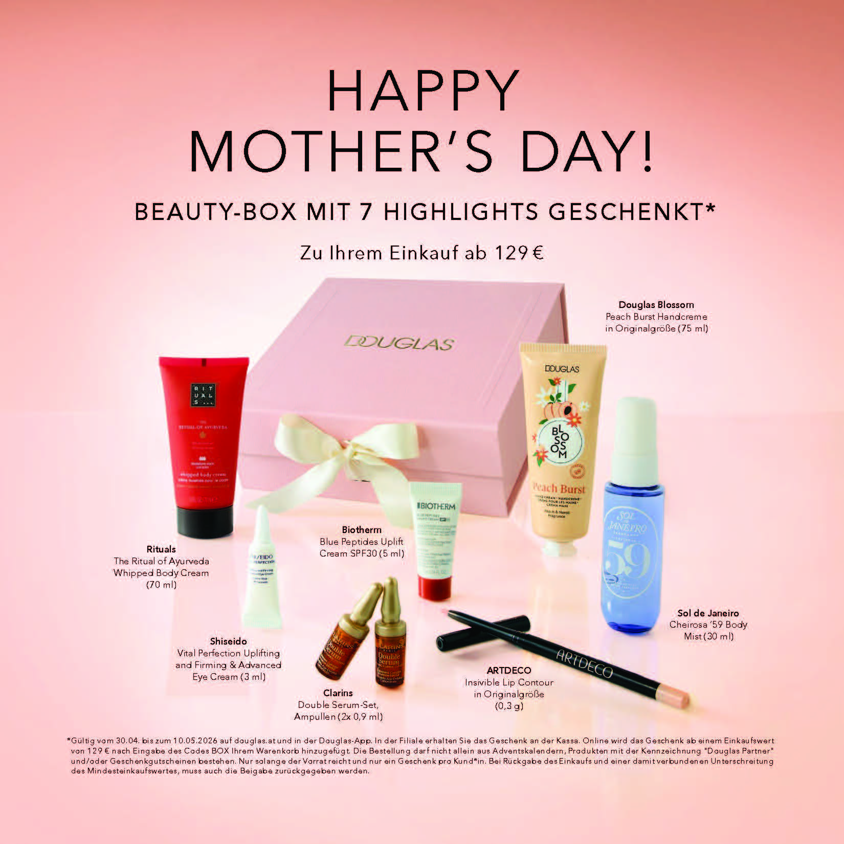 Sagen Sie Danke mit einem ganz besonderen Geschenk! Bei Douglas in der ShoppingCity Seiersberg wird der Muttertag mit einem exklusiven Highlight gefeiert: Vom 30. April bis zum 10. Mai 2026 erhalten Sie eine limitierte Beauty-Box mit 7 Highlights geschenkt!