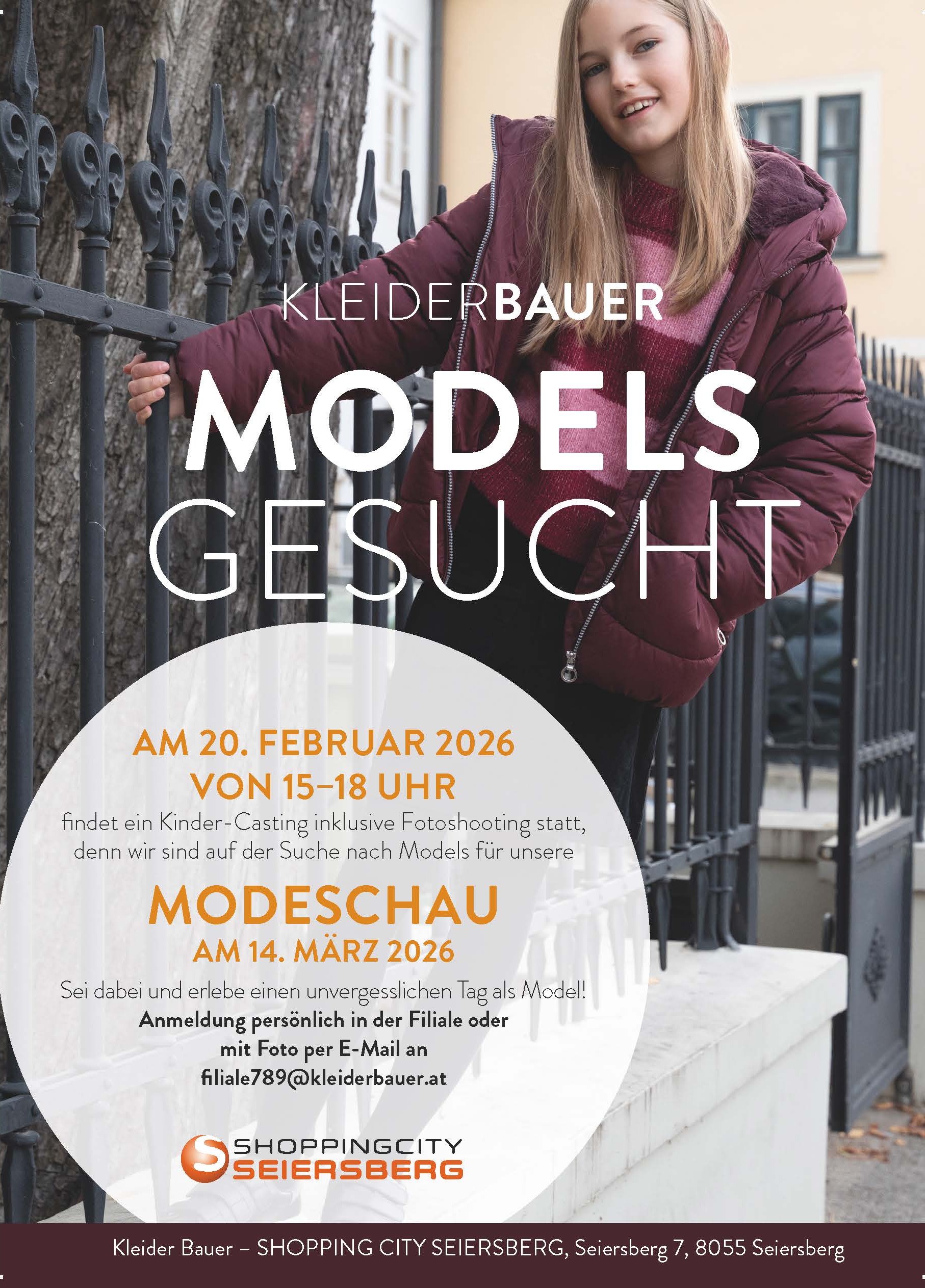 Kleider Bauer in der ShoppingCity Seiersberg sucht junge Talente für die kommende Modeschau! Am 20. Februar 2026 findet von 15:00 bis 18:00 Uhr ein spannendes Kinder-Casting inklusive professionellem Fotoshooting direkt in der Filiale statt.