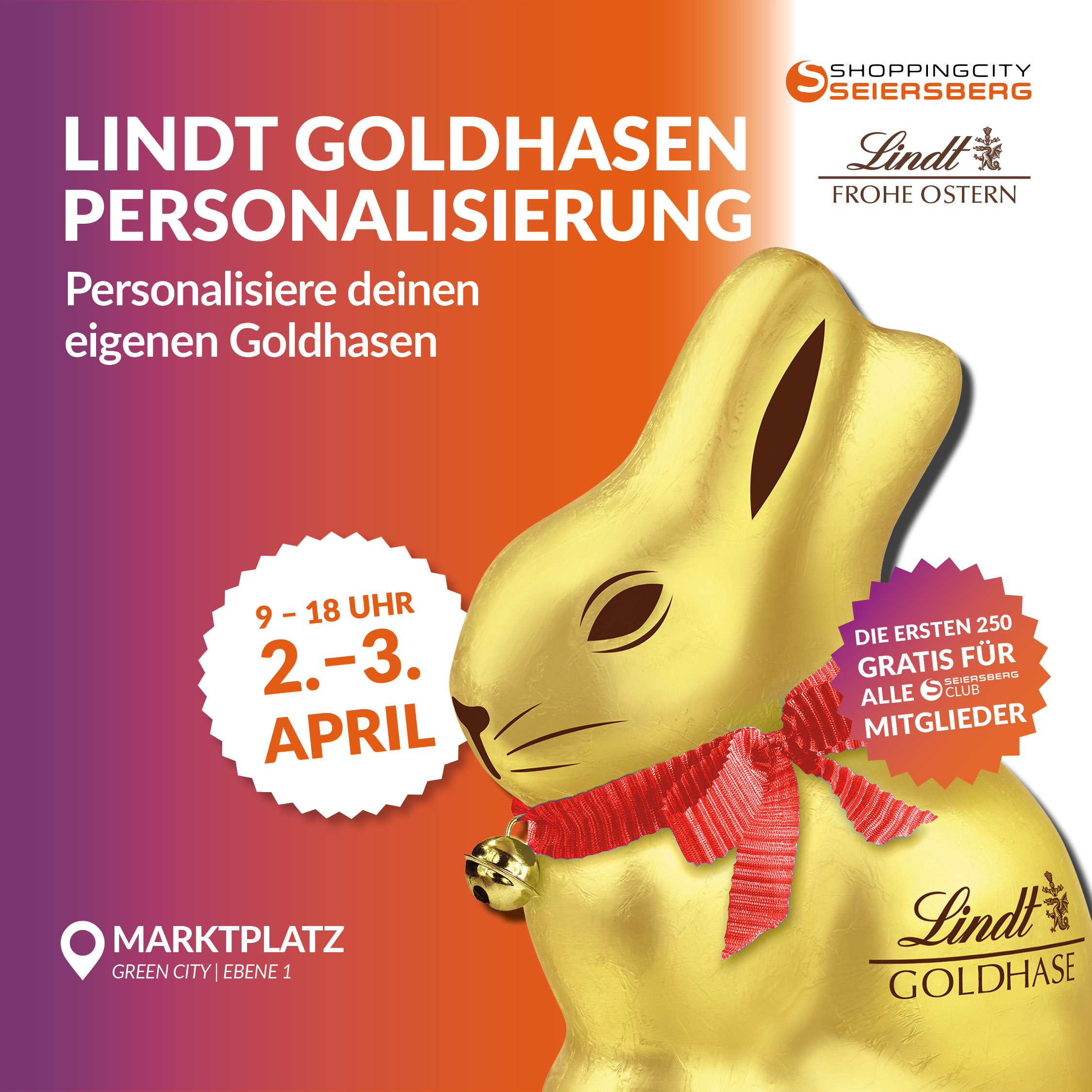 Besuchen Sie uns von 9:00 bis 18:00 Uhr am Marktplatz (Green City, Ebene 1) und lassen Sie Ihren eigenen Goldhasen individuell beschriften. Ein besonderes Highlight wartet auf unsere treuesten Kunden: Die ersten 250 Exemplare sind für alle Mitglieder des ShoppingCity Seiersberg Clubs gratis erhältlich.