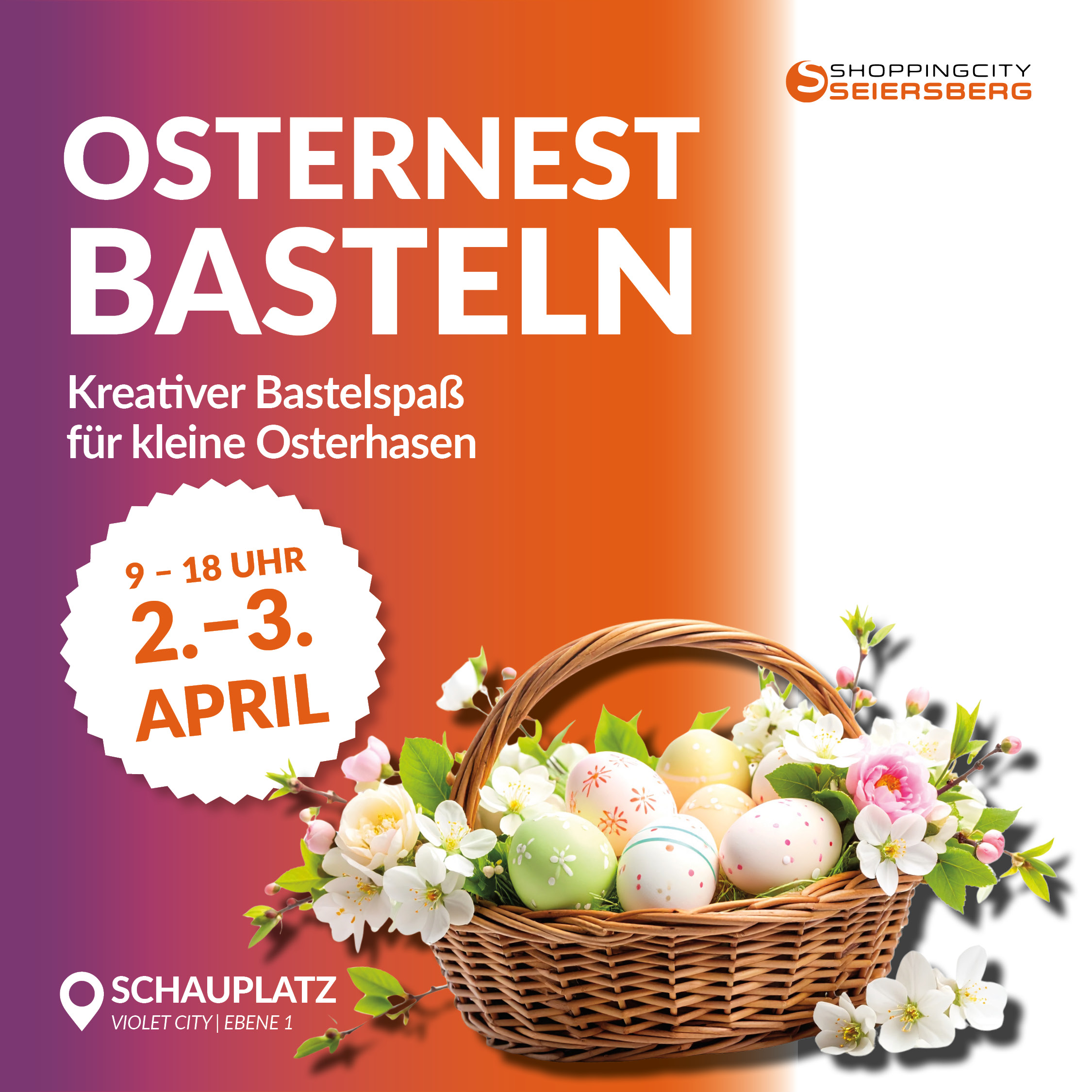 Die Osterzeit in der ShoppingCity Seiersberg wird kreativ! Wir laden alle Kinder herzlich ein, am 2. und 3. April 2026 ihr ganz persönliches Osternest zu gestalten. In der Zeit von 9:00 bis 18:00 Uhr verwandelt sich der Schauplatz in eine bunte Bastelwerkstatt, in der unter Anleitung gebastelt, geklebt und verziert werden kann.